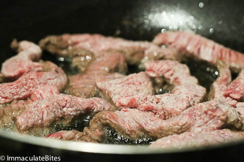 - Heat up the Wok with about ¼ -1/2 cup oil, and then add meat let it rest for about 30 seconds before stirring. Cook for 2 minutes or until beef reaches desired doneness-it should barely cook in the center, stir the meat around a little so that it cooks evenly. Remove and keep warm. Transfer beef to a plate and remove any excess oil from the saucepan.