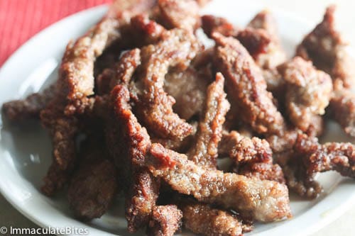 - Slice the beef against the grain in little pieces. Then mix with the cornstarch. Remove from cornstarch, shake off and let it rest for about 10 minutes.