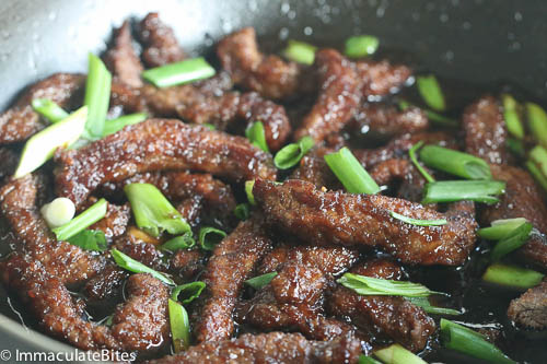 - Finally add scallions, stir, remove steak with slotted spoon and serve over white rice