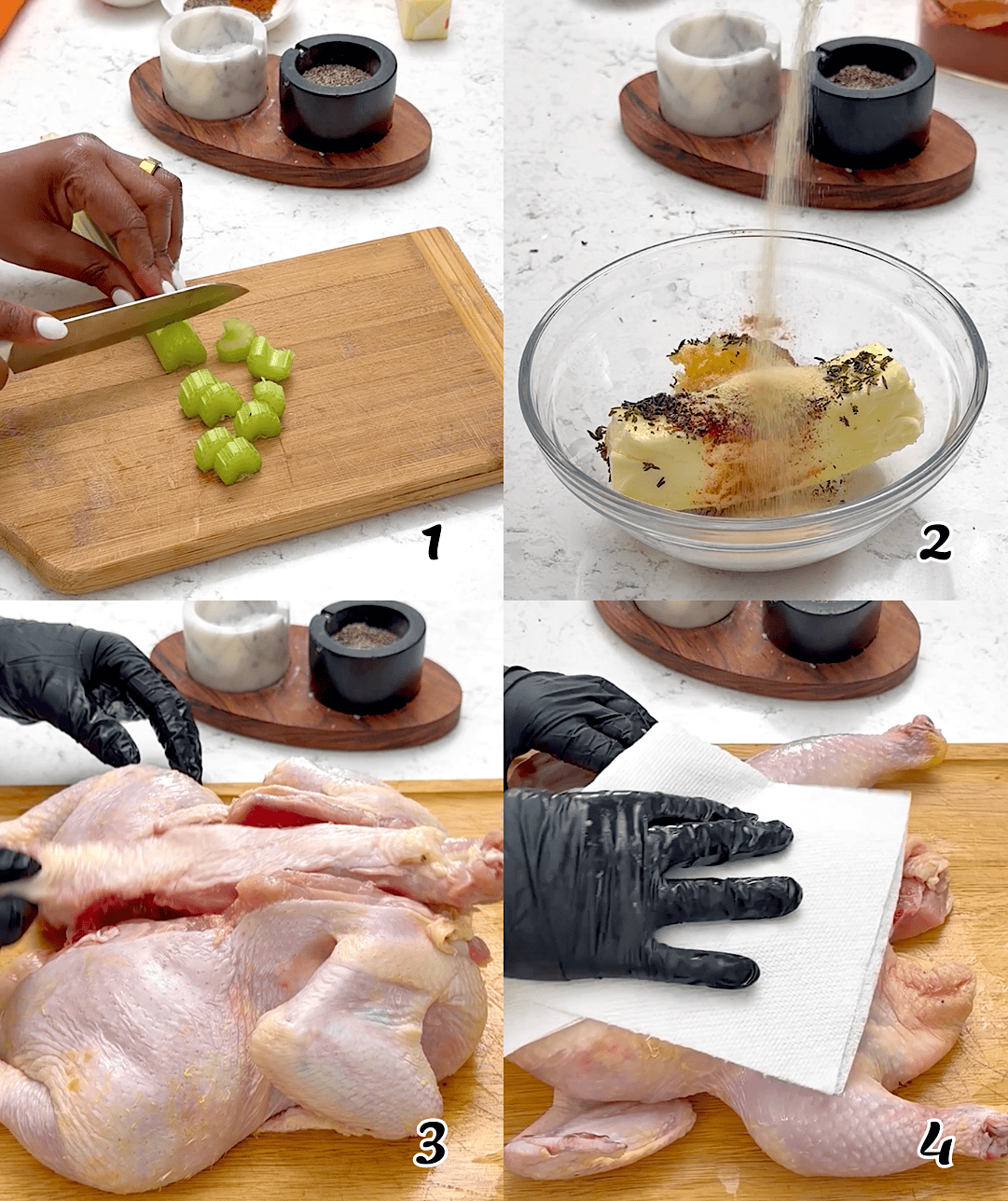 - Chop the vegetables and set aside. Make the blackened seasoned butter. Spatchcock the chicken and pat it dry so the spices stick.