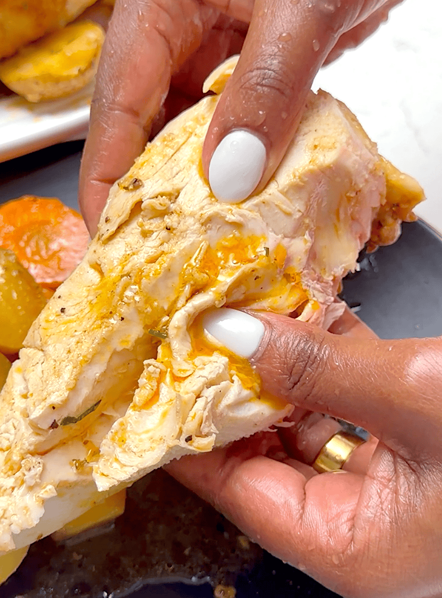 Let it stand 5-10 minutes before carving the chicken. Enjoy it with the roasted vegetables and your favorite sides.