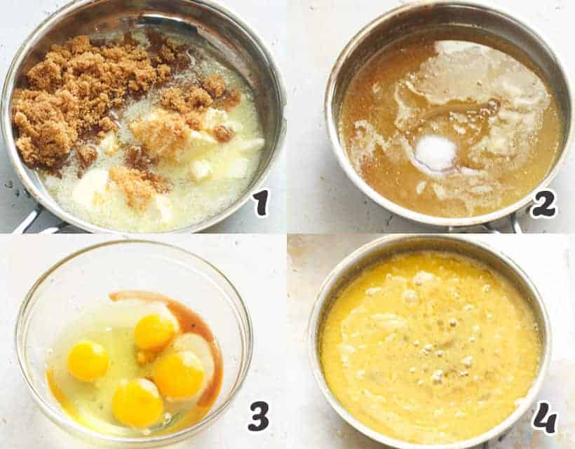 - Heat the butter and brown sugar in a large skillet or saucepan over medium heat. Quickly stir to combine, then whisk in the corn syrup and salt. Let it cool slightly so you don’t cook the eggs when you add them. (Photos 1-2)