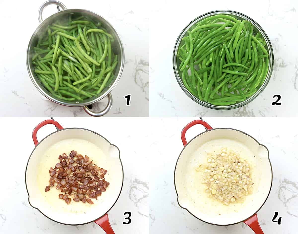 - Blanch Green Beans – Bring a pot of water to a boil, then add green beans and let them cook for 4-5 minutes. Remove them from the water and place them in ice water to stop the cooking. Drain and set aside. You can do this step in advance, then refrigerate the green beans until ready to serve the dish to save time. (Photos 1-2)