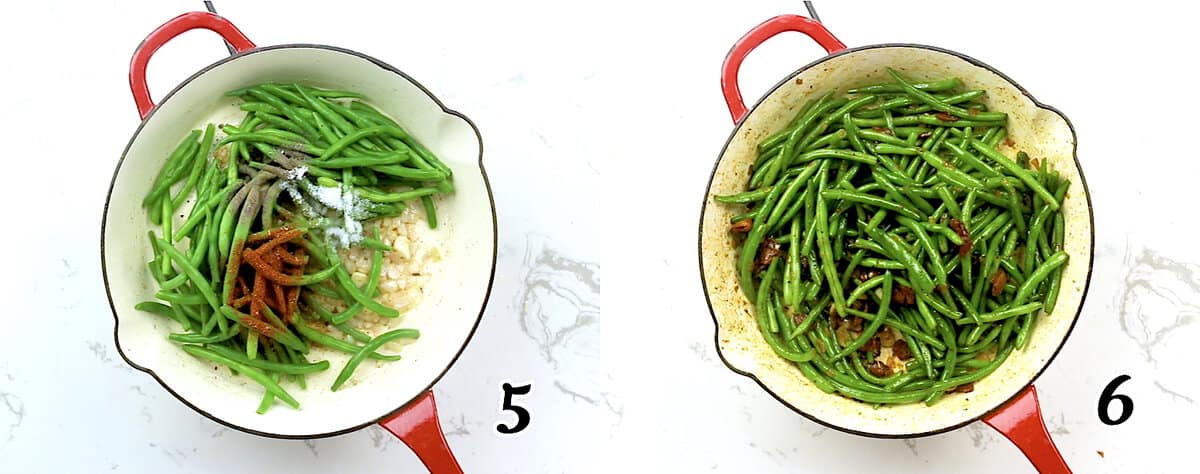 - Saute – Next, saute the sliced garlic and onion for 2 minutes. Then add green beans and Creole seasoning. Continue stirring for 3-5 minutes. (Photos 4-6)