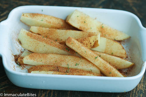 - Prepare – Scrub potatoes, clean and cut them into the desired shape – the thinner the cut, the less time to cook – make sure they are even for even cooking.