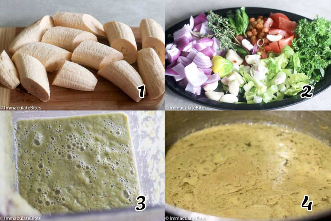 - Add the plantains, bouillon or Maggi, and enough stock or water to cover the plantains. Simmering until the plantains are super tender (an hour or more). Add water as necessary to prevent burning. (Photos 6-8)
