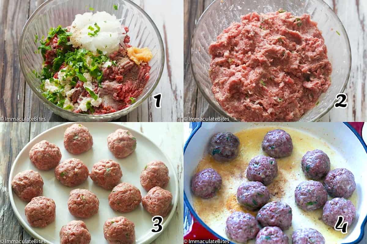 - Then add parsley, white pepper, grated onions, hot pepper, and minced garlic. Lightly mix the meatball mixture with your hands and shape it into 14-16 balls, being careful not to overmix—store, covered, in the refrigerator until needed. (Photos 1-2)