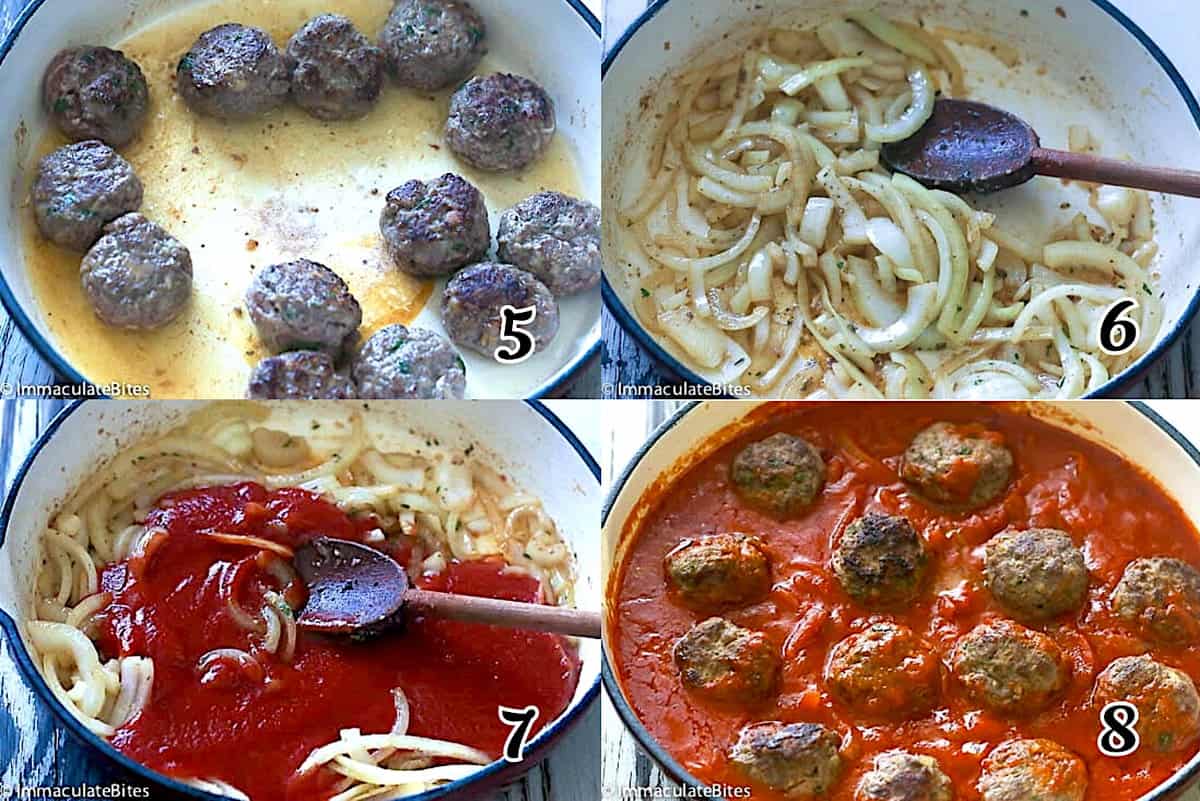 - Add the meatballs 10- 15 minutes before the sauce is ready. Adjust seasonings to your tastes and the consistency with water or stock. (Photo 8)