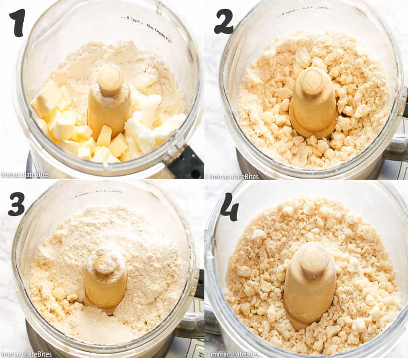 - Pulse – Remove the flour mixture and add about half to a food processor, followed by butter and cream cheese. Pulse for a few seconds, then add the remaining flour. (Photos 1-4)