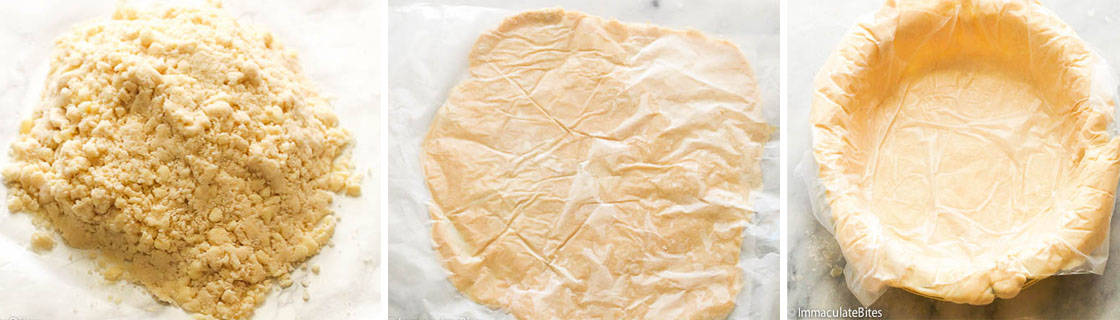 - Shape – Roll out the larger piece of dough into about a 12-inch circle. Roll the smaller dough ball out into a circle and then slice it into long strips for the lattice.