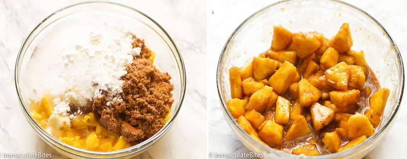 - Combine – In a large bowl, combine pineapple, brown and granulated sugar, cinnamon spice, nutmeg, flour, salt, lemon zest, lemon juice, and rum. Mix well. (Photos 8-9)