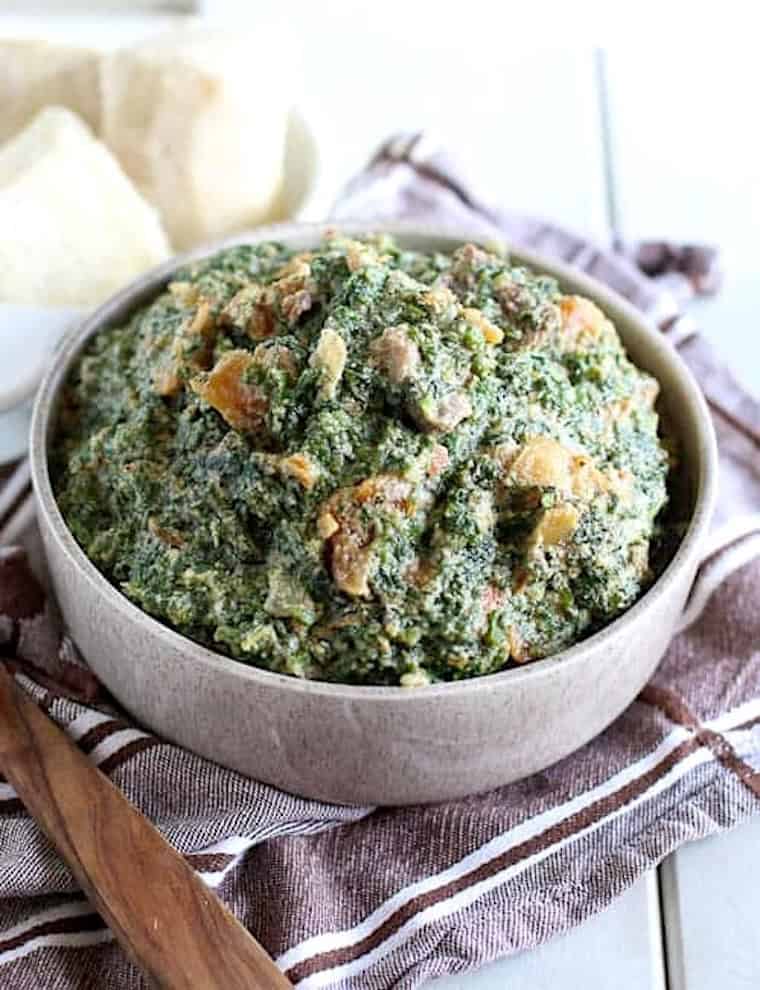 In countries like Cameroon, Nigeria, Ghana, and Sierra Leone, we use the fluted pumpkin or ugu leaves. They’re not quite the same as the pumpkin leaves you would get here in the U.S., but don’t be afraid to use what you have.