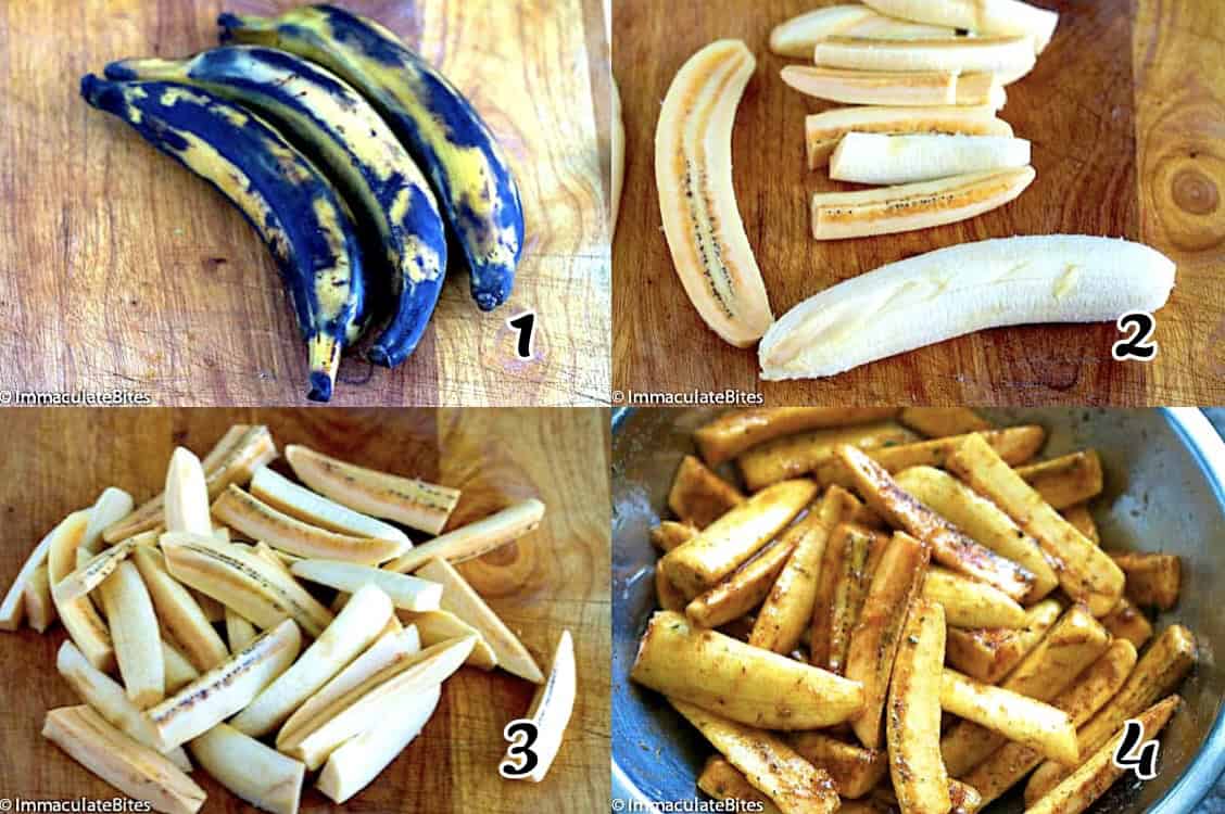 - Peel the plantains, then cut them in half crossways, then cut in half lengthways, and cut into desired uniform strips. (Photos 1-3)