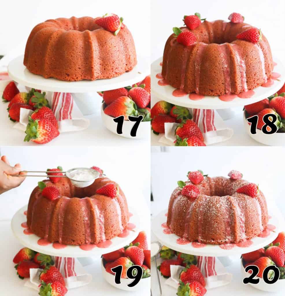 - Make the Glaze – Add the remaining pureed strawberries, lemon and strawberry extract, and powdered sugar in a medium bowl. Whisk until smooth and adjust the consistency with more powdered sugar or milk if needed. (Photos 15-16)