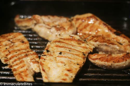 - Cook Chicken – Lightly spray a nonstick fry pan with oil. Preheat the skillet over medium-high heat. Place chicken in the skillet and cook for 5-6 minutes on each side (until the juice runs clear). You may have to turn the chicken more than once to make sure the chicken browns on both sides.