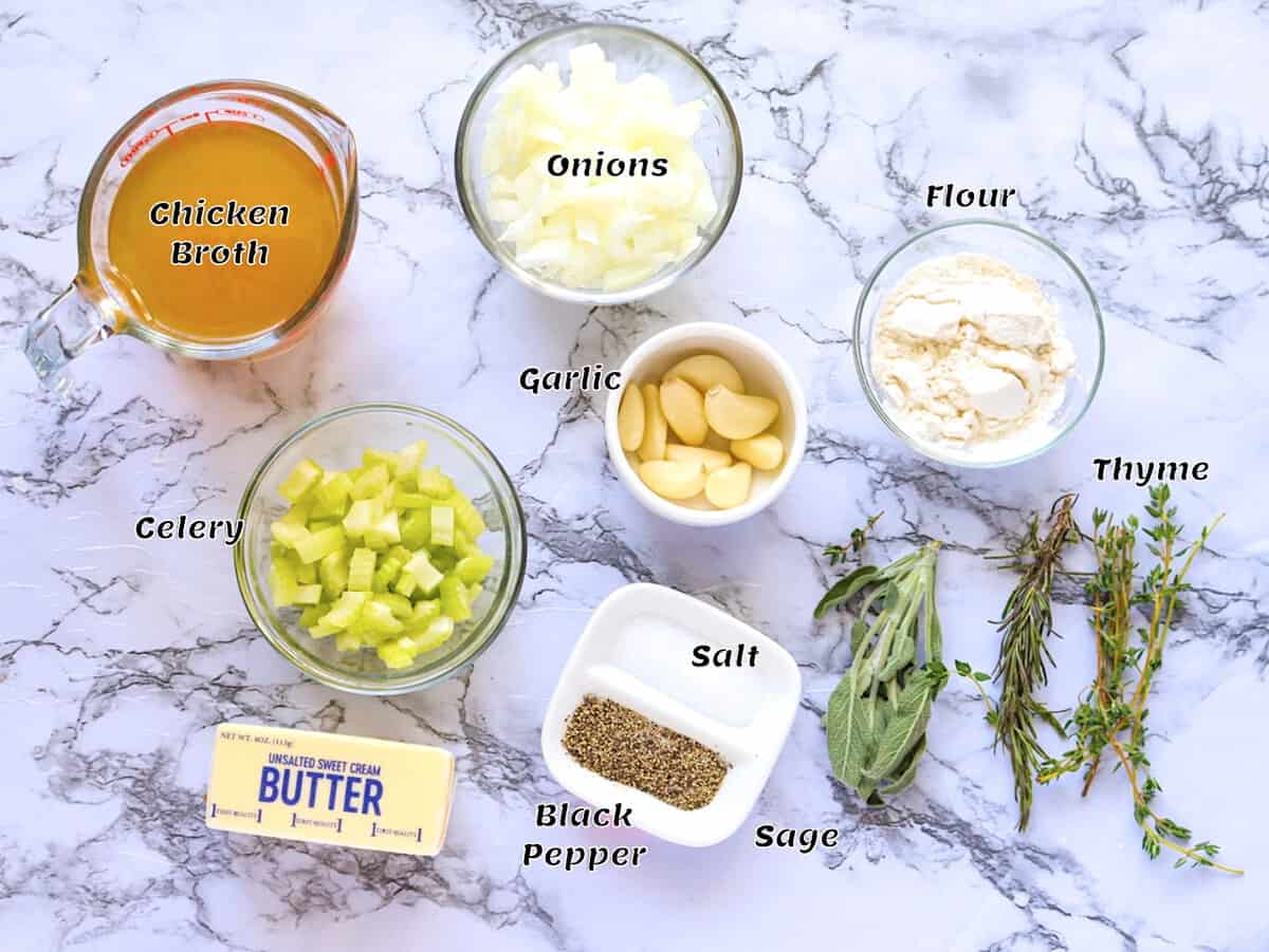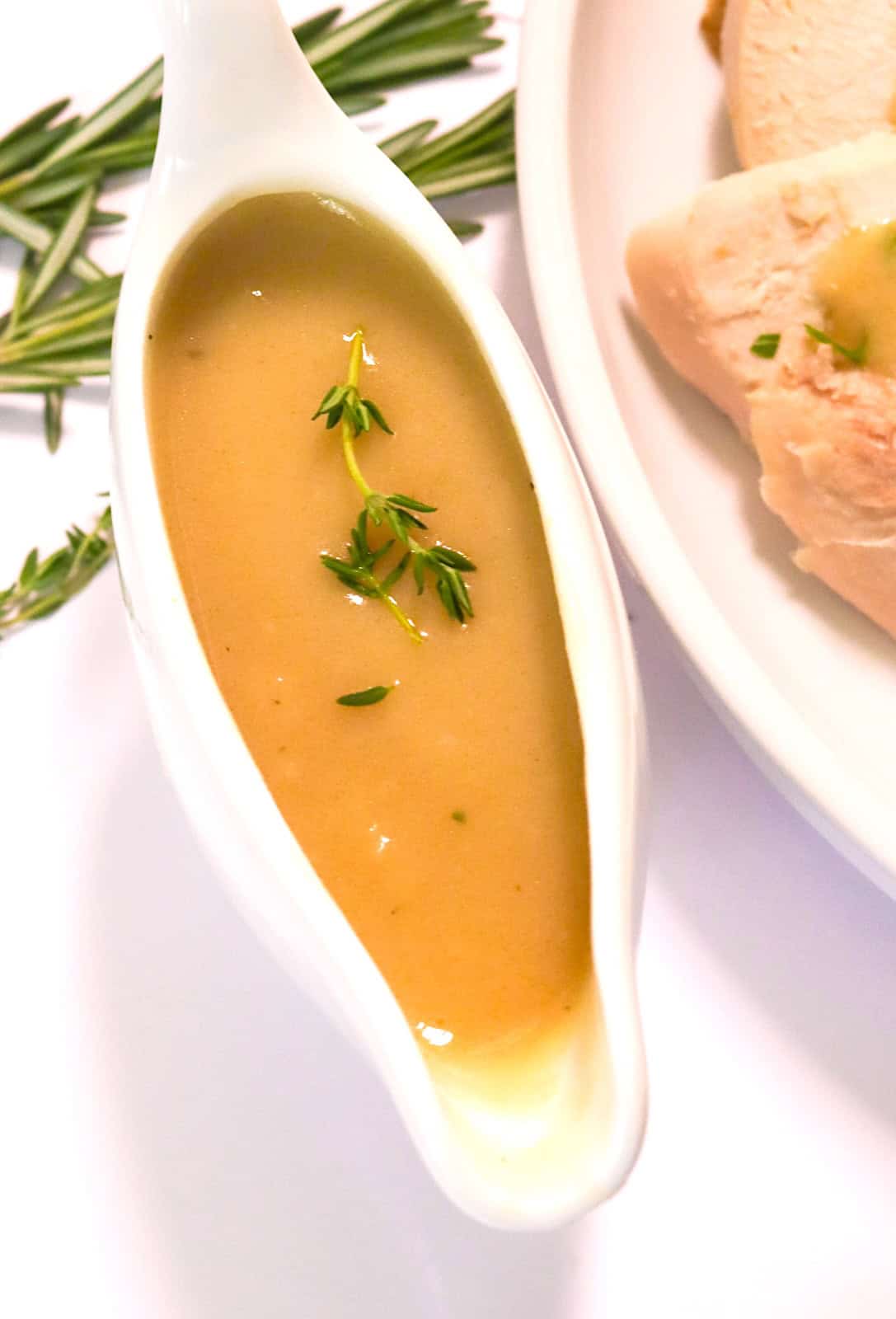 First, the roux (butter and flour) is the thickener. Then chicken broth and your favorite aromatics, and voila! A mouthwatering, silky gravy without drippings!