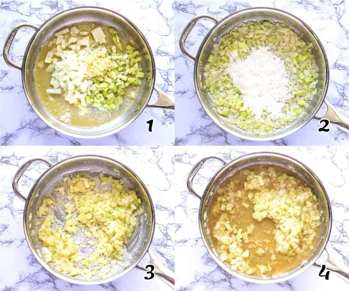 - Cook Aromatics – Melt butter in a 10-inch skillet over medium-high heat. Add onion, celery, and garlic. Cook, stirring occasionally, for 6-8 minutes to allow the vegetables to soften. (Photo 1)