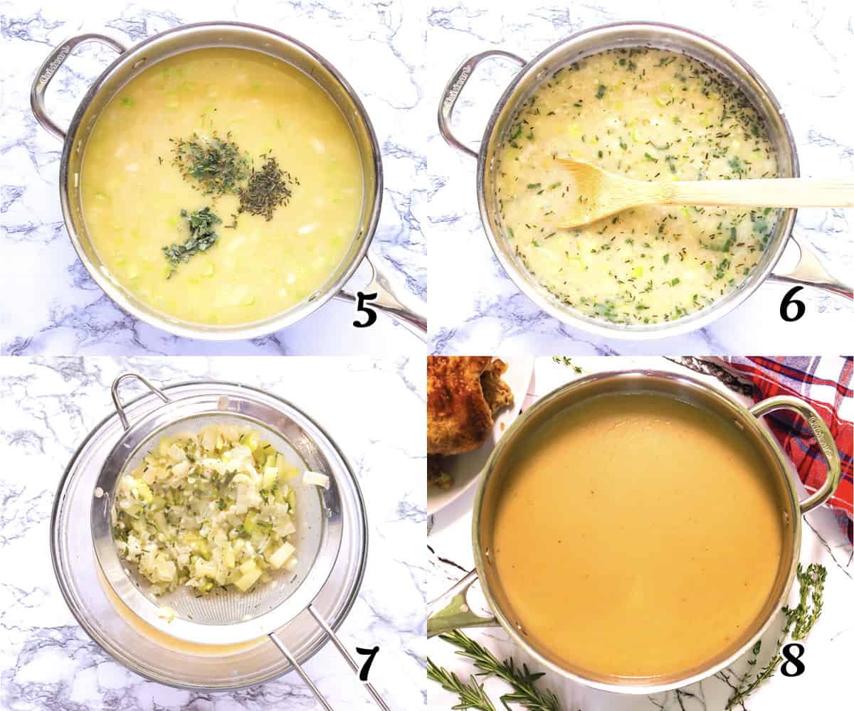 - Strain – Separate the gravy and veggies with a strainer. Discard the vegetables (or puree them into your gravy with an immersion blender). (Photo 7)
